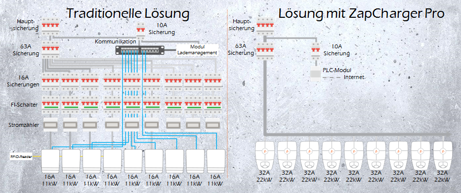 Mit nur 63A können bis zu 100 Elektrofahrzeuge geladen werden.